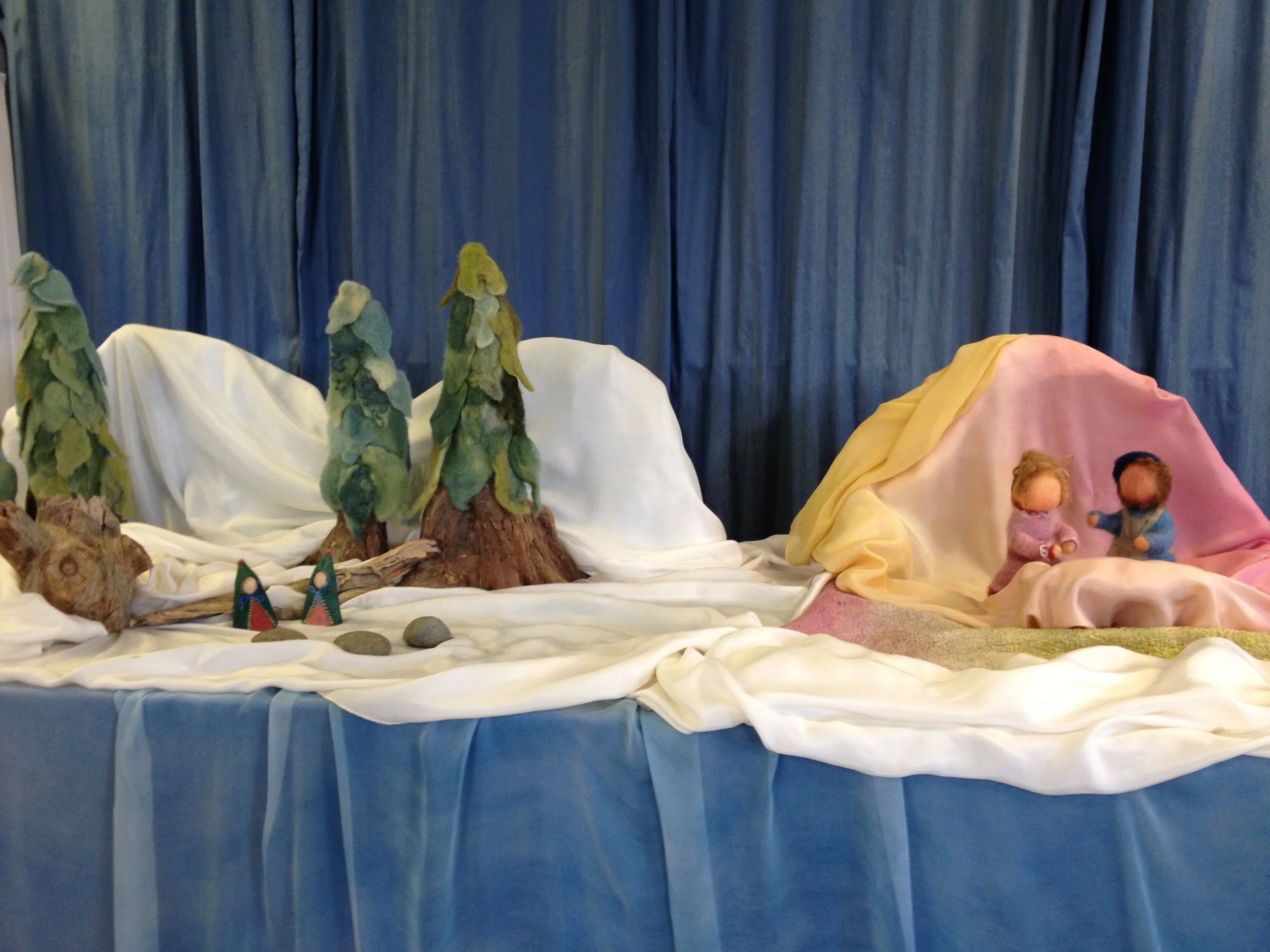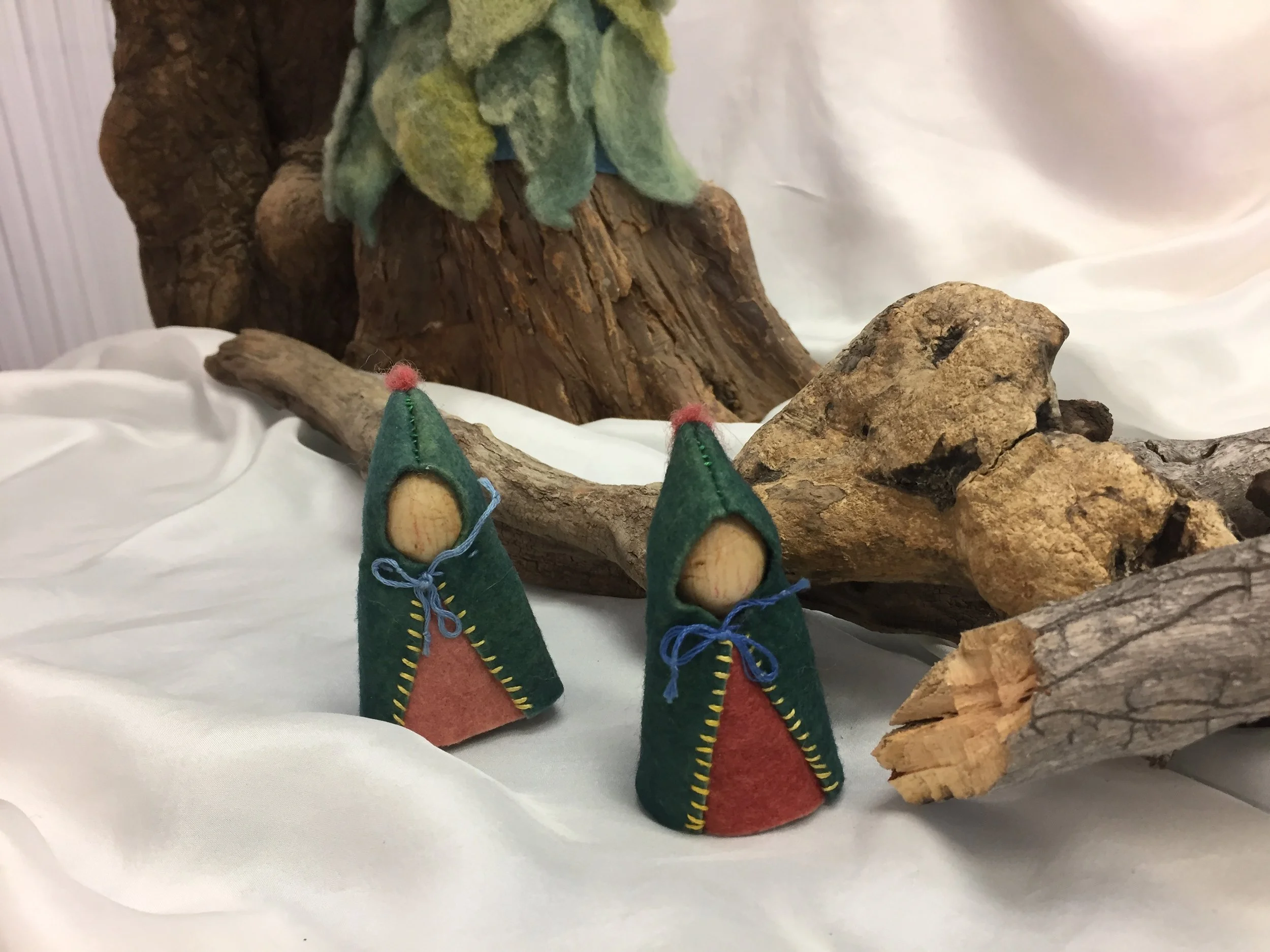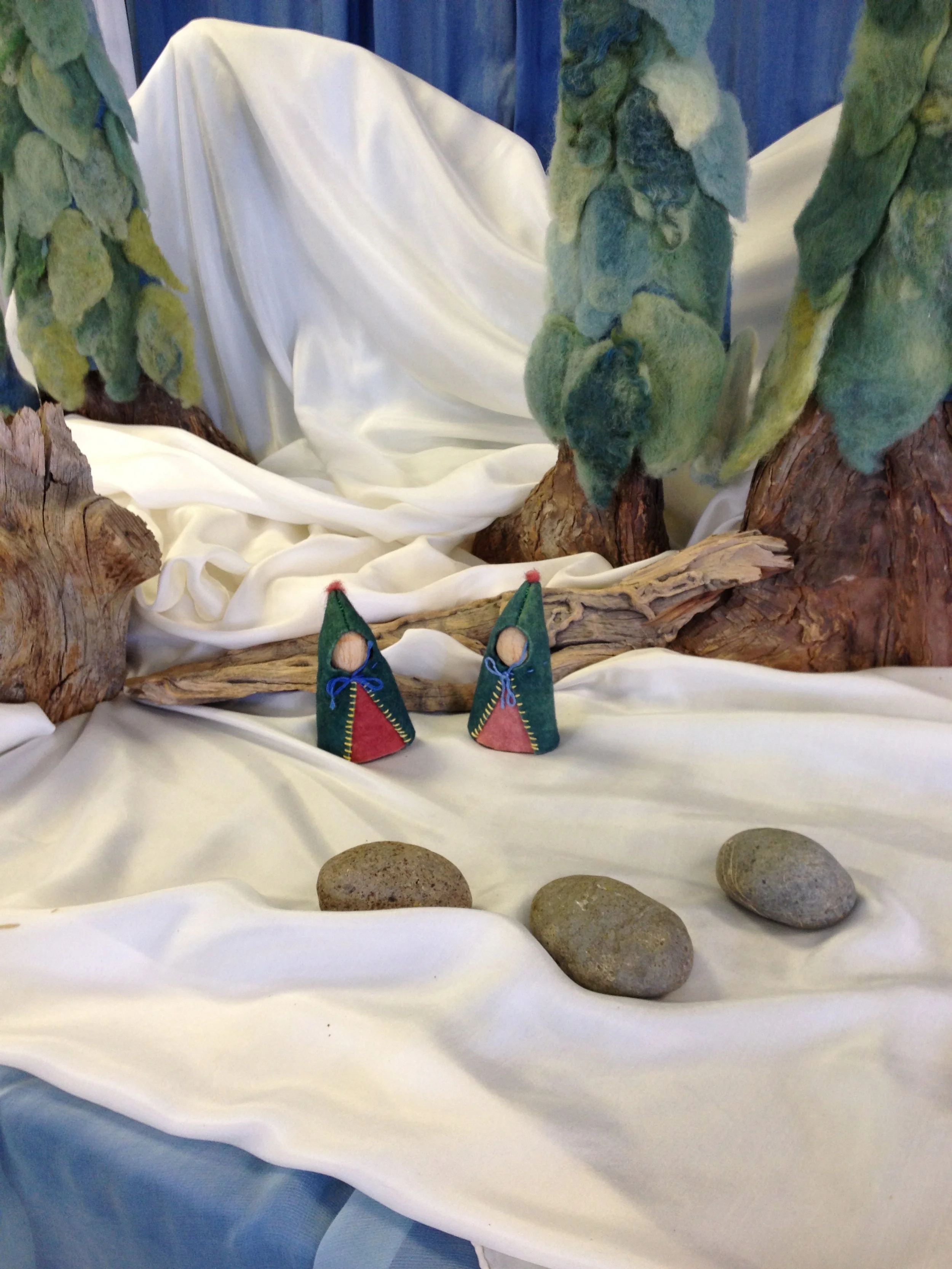 Now it was Christmas Eve and the gifts were all finished and instead of leaving the cut-out leather on the table as usual, the shoemaker and his wife left the pretty articles of clothing. Then they went and hid themselves and waited and watched to see how the little men would behave themselves. When it was midnight, (ring a chime 3 times) two little men with nothing on came bounding over the snow.