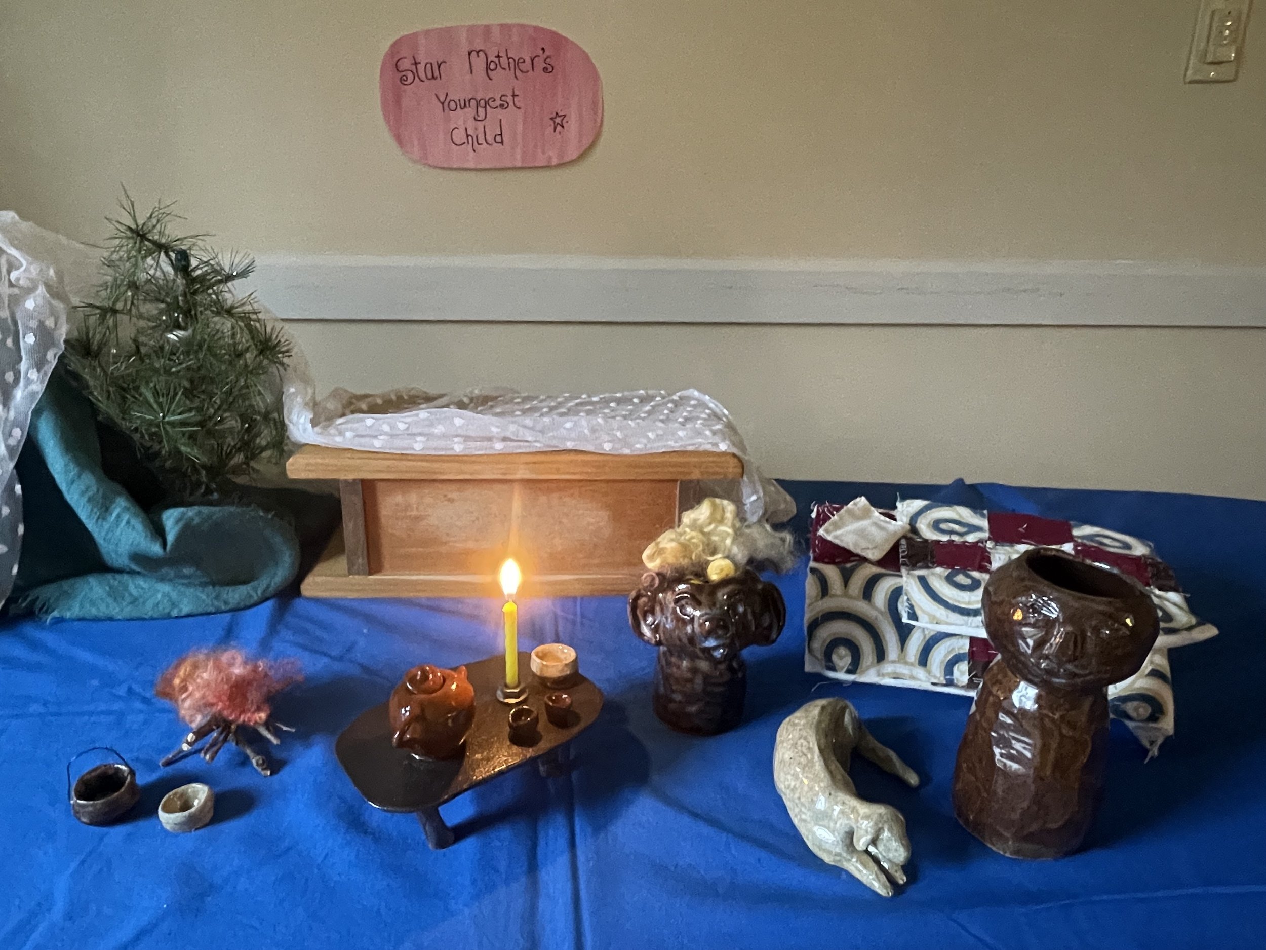 For a Christmas puppet show I chose the story, "Star Mothers Youngest Child" to tell at the local free library in Claverack, NY. The old woman in this story happened to be a piece I made out of clay and thought would be best to throw away. Our pottery work leader suggested I wait and keep it for another day or two. The next morning, I knew that that was the old woman and I would need to make the Star child as he appeared on earth. When that was done, I was busy making Uproar the dog, the table for the kitchen, a teapot and cups, bowls and a cooking pot for porridge. When the work was done in the pottery and the figures were glazed and fired, I made the quilt for the old woman's bed. A smaller quilt made with the same pattern was for her to wear as she left her night's sleep and went to see who was knocking at her door on that fine Christmas morning.