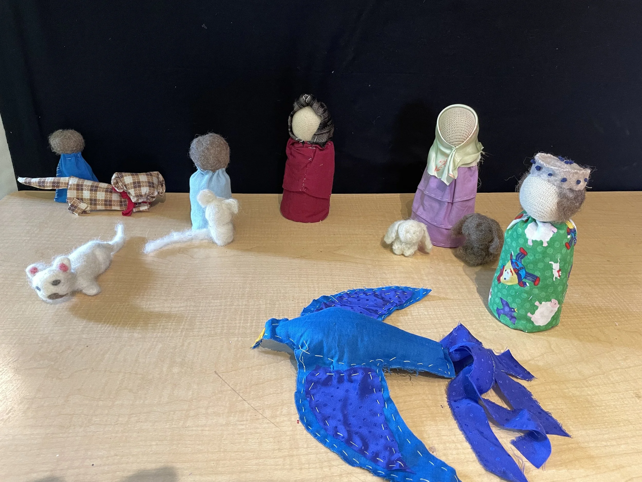 As we approached the completion of sewing our own puppets, I went to Louisa, one of three volunteers in my class and asked her if she could help me to create a story for these characters. She said, "I already have the story." She had created it in her imagination throughout the time of sewing the puppets. She brought it typed and ready on the next class. It is titled "Finding Home", and it takes place at Christmas time.