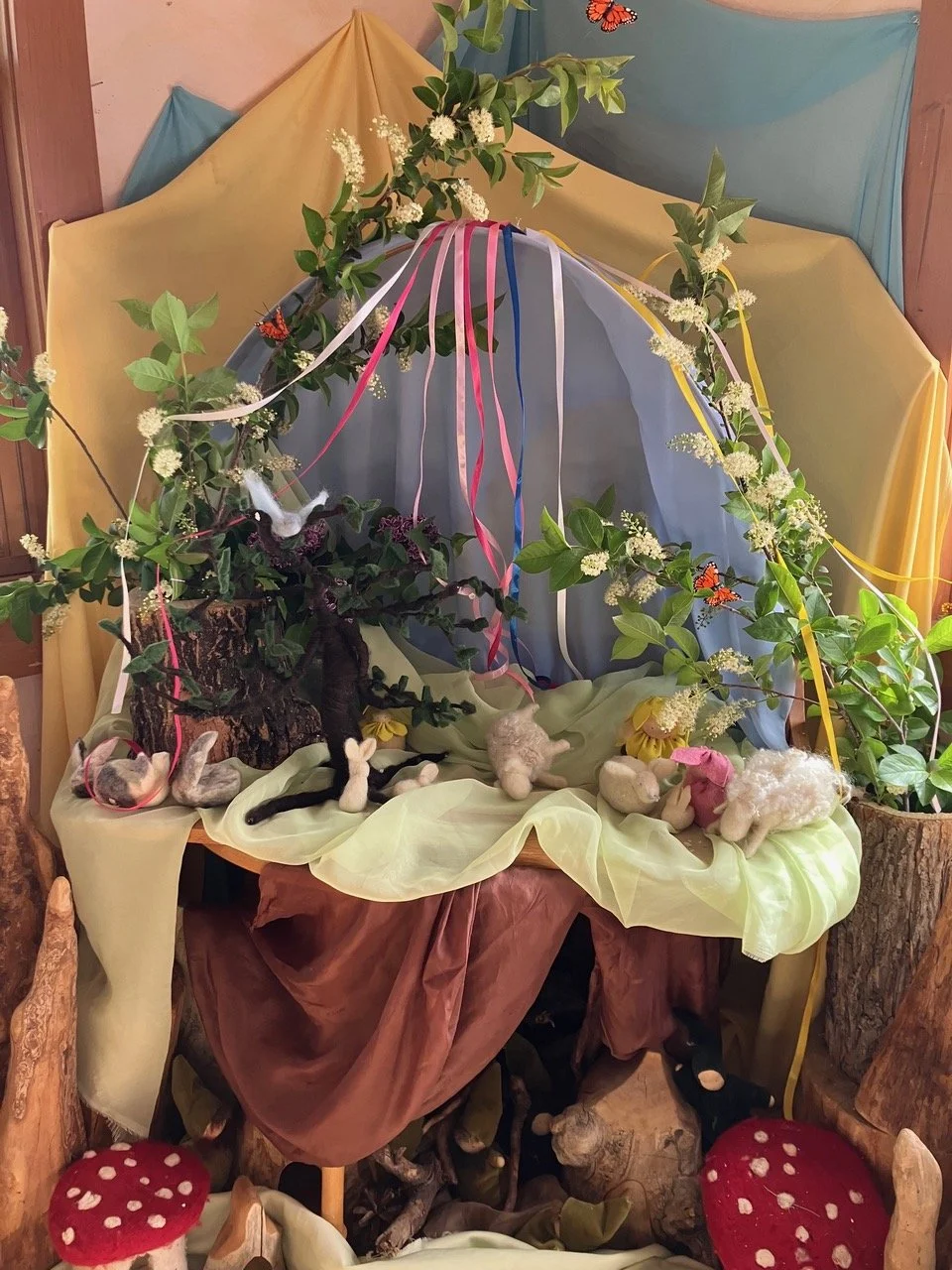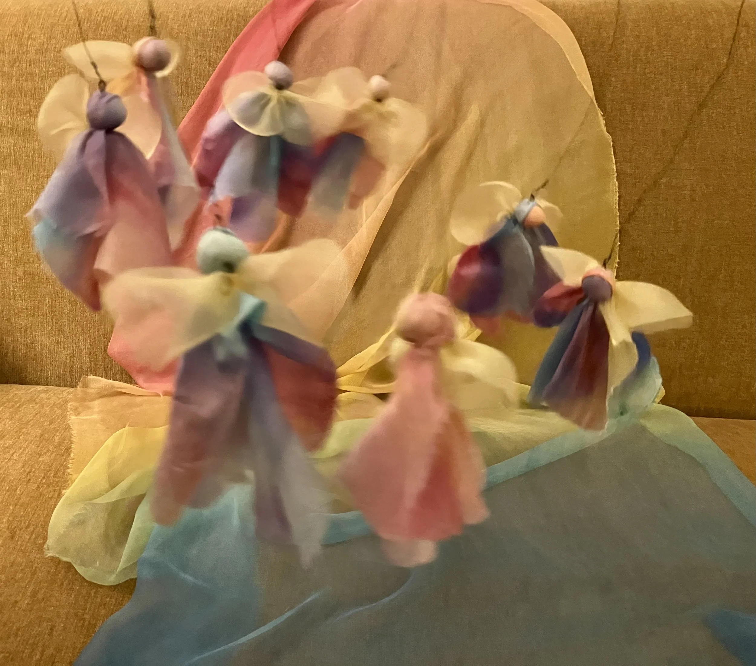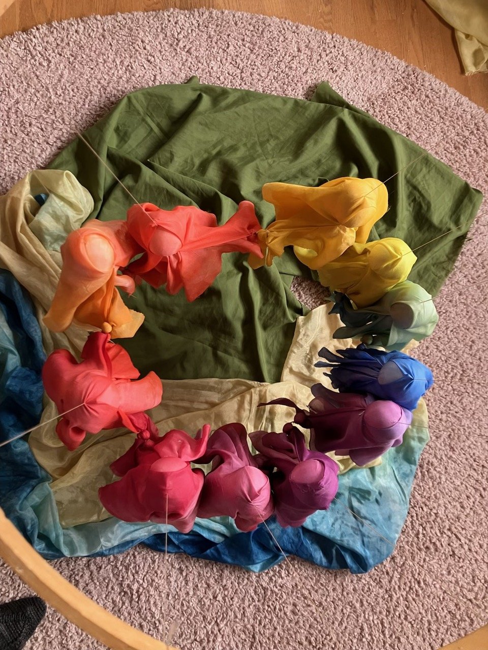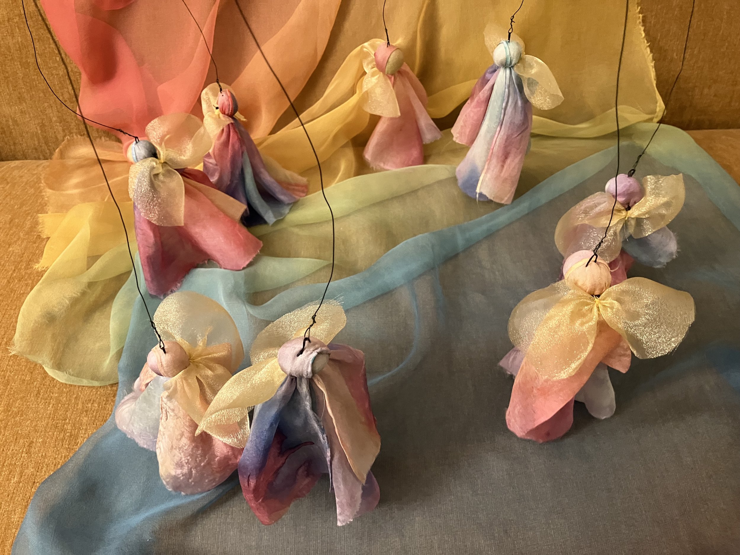 We will view a video of this puppet show and another brief video of the fairies dancing in the garden, and then we will make the moving ring of fairies either out of silk scraps or wool roving. Mindy Upton will demonstrate how to make the fairies of wool fleece or roving and Marjorie Rehbach will show how to make them out of silk scraps with a stiff transparent golden fabric, or something similar, for wings. We will show how to attach them to a hoop,with a magic handle, so you can easily move the ring of fairies in lovely fluid ways. These fairy rings are very versatile and can be used for many types of puppet shows and storytelling events. When you sign up you will receive a materials list and other resources so you can prepare!