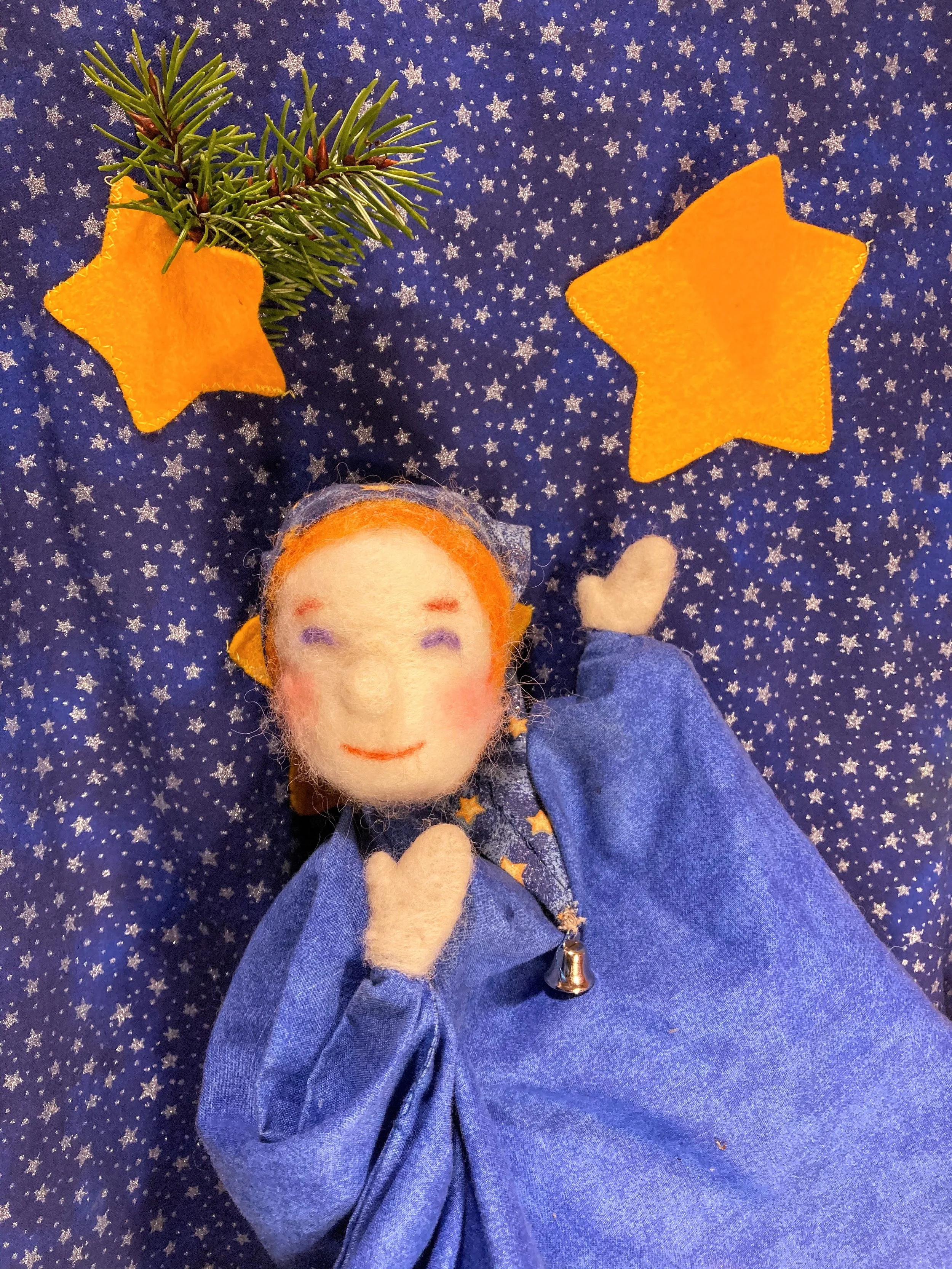 In my training with Suzanne Down, I learned to make a very expressive rod puppet called Wee Willie Winkie. He has been a marvelous helper. When he appears, the children can speak to him as if I am not even there! Often, when a child comes to me to receive extra support for building foundational systems, they do not know why they are there. It is a perfect “Mr. Rogers” moment to let the puppet talk about important things in a way the child can accept. After our initial greeting, I invite everyone to sit on the floor. Before I begin, I ask the child if they like puppets and then I tell them I have my puppet in the basket. He sleeps a lot but loves to meet children. He has very delicate ears and will not wake up if we are too loud. So using our nicest voices, we can say, “Wake up Wee Willie Winkie,” and then we must listen for the tinkling of the tiny bell on his cap which will tell us if he is waking up or not. He usually begins to wake and then goes back to sleep a few times, which tends to bring giggles, smiles and some relief to the children. Finally we sing the Wee Willie Winkie song and sure enough he wakes up and can meet and greet everyone and conversations can happen. Before he goes back to sleep, he asks the children what they want to work on that day, or if they are ready for an adventure. Then he yawns, we say good bye in fun ways and he goes to rest while we go to work. Sometimes he gives the children something (like a balloon, etc.) before he goes to rest. This is a nice transition because who doesn’t like a balloon?